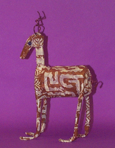 This piece of artwork is an African Gazelle. A numerous amount of species of gazelles can be found on the open plains and semi deserts of Mongolia to the Atlantic coast of North Africa and throughout Eastern and Central Tropical Africa. They usually travel in herds containing 5 to 10 individuals. Out of the many species of gazelles some have been considered endangered. The materials I used to make the gazelle were wire, a soda can, newspaper, and plastic bags. The wire was used to make the legs, head and antlers. The body was made with a soda can and covered with newspaper and plastic bags. I used these materials because of the ease that was found for shaping the gazelle. The plastic bags were a perfect color for the outside and the soda can was easy to crush to make a slender body. The newspaper was used to wrap the wire and the soda can so I would have a nice surface for the plastic bags. The wire was also good to shape the antlers, legs and head because it was fairly easy to bend. These materials were great to use and were obviously easily accessible because they were recycled goods. |