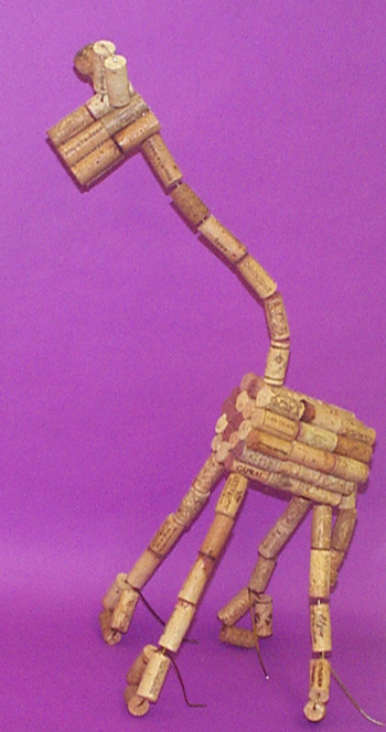 Giraffe Since giraffes come from Africa and they are so adorably cute, I decided to make one. This giraffe was constructed solely of recycled corks from wine bottles and sculpture wire. This giraffe is a baby since he is bowlegged and can barely stand by himself. |
