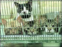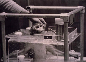 Animals are kept in clear, white, plastic boxes, or wire cages depending on the size of the animal. Usually, more than one animal lives in a box. Social primates like monkeys often live with other monkeys, but most other large animals usually live alone. Often, primates get to spend some time every day in a larger cage where they can play. Most other animals stay in their cages all the time except when they are being used in experiments. Strict laws insure that the cages are warm, clean, and big enough. However, they are still kept in cages. A cage can never be as interesting, stimulating, or open as a natural habitat. This can be a problem--especially for the more intelligent animals like dogs, cats, pigs, and primates. They can become tremendously lonely and bored unless they have things to play with or ways to get more exercise.
