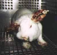 In these tests, a liquid, flake, granule, or powdered substance is dropped into the eyes of a group of albino rabbits. The animals are often immobilized in stocks from which only their heads protrude. They usually receive no anesthesia during the tests. After placing the substance in the rabbits' eyes, laboratory technicians record the damage to the eye tissue at specific intervals over an average period of 72 hours, with tests sometimes lasting 7 to 18 days. Reactions to the substances include swollen eyelids, inflamed irises, ulceration, bleeding, massive deterioration, and blindness. During the tests, the rabbits' eyelids are held open with clips. Many animals break their necks as they struggle to escape. The results of eye irritancy tests are questionable, as they vary from laboratory to laboratory-and even from rabbit to rabbit. Acute toxicity tests, commonly called lethal dose or poisoning tests, determine the amount of a substance that will kill a percentage, even up to 100 percent, of a group of test animals.