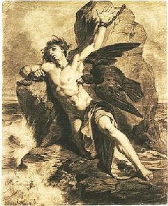 | Did I solicit thee From darkness to promote me? -- John Milton, Paradise Lost Prometheus was the creator of man in Greek Mythology. He was given this task to save himself from being imprisoned in Tartarus during the war of the Olympians. He shaped men from mud and loved them very much and depended on his brother Epimetheus to give them good qualities; however, these qualities had already been given to the animals so Prometheus decided to give them fire which he stole from Zeus. When Zeus discovered this he was extremely angry and demanded Prometheus to tell him how to reverse the knowledge of the mortals. When Prometheus denied Zeus' demands he was hung in chains from a mountain where a vulture would eternally pluck out his organs during the day, and then during the night they would very painfully grow back. Prometheus' determination never shattered and he was eventually saved by Zeus' son Hercules. www.prometheus--GreekMythology.htm |